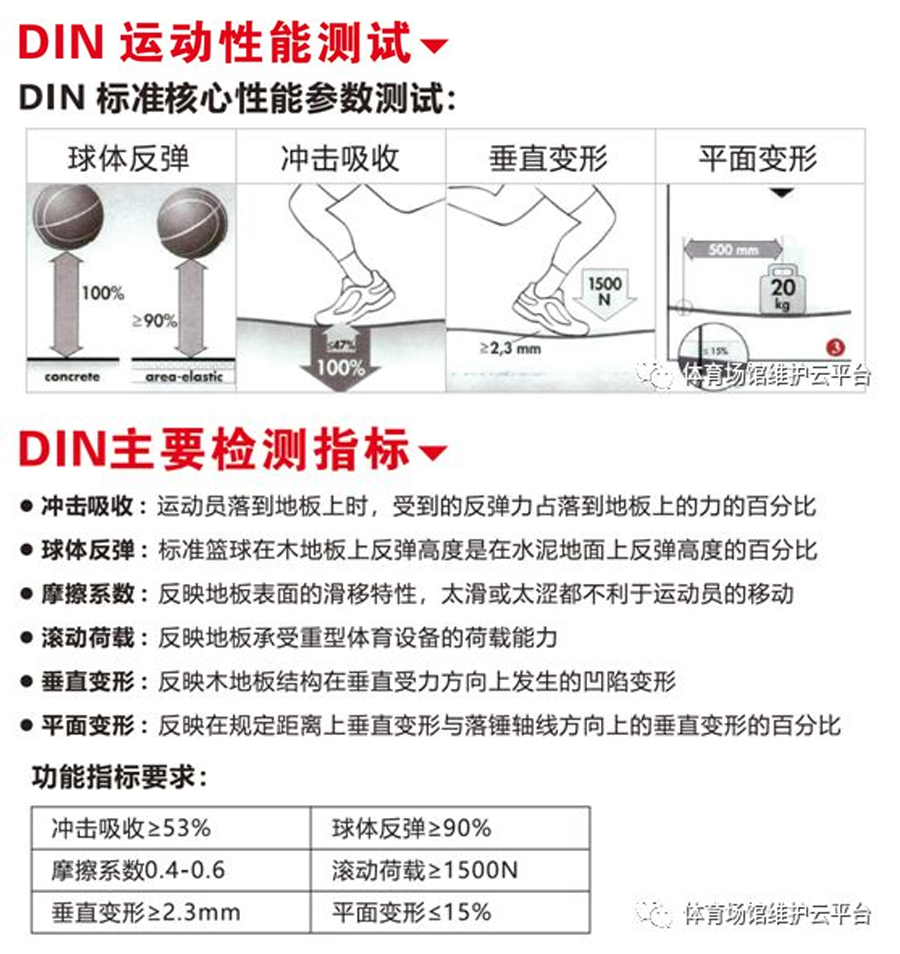 專業(yè)的運(yùn)動木地板,是具有保護(hù)性能、運(yùn)動性能和技術(shù)性能的特殊功能性地面材料,不是普通的裝飾性地材,國際上通常按照DIN18032或EN14904標(biāo)準(zhǔn)對這些功能進(jìn)行性能指標(biāo)量化,通過可檢測出的數(shù)值來評估運(yùn)動木地板的整體功能是否滿足需求。六大性能指標(biāo)包含球體反彈性能,沖擊吸收性能,垂直變形量,平面變形控制,滾動負(fù)載性能及滑動摩擦擦系數(shù),國標(biāo)GB∕T 20239-2015 《體育館用木質(zhì)地板》也是根據(jù)上述標(biāo)準(zhǔn)原則制定的。
