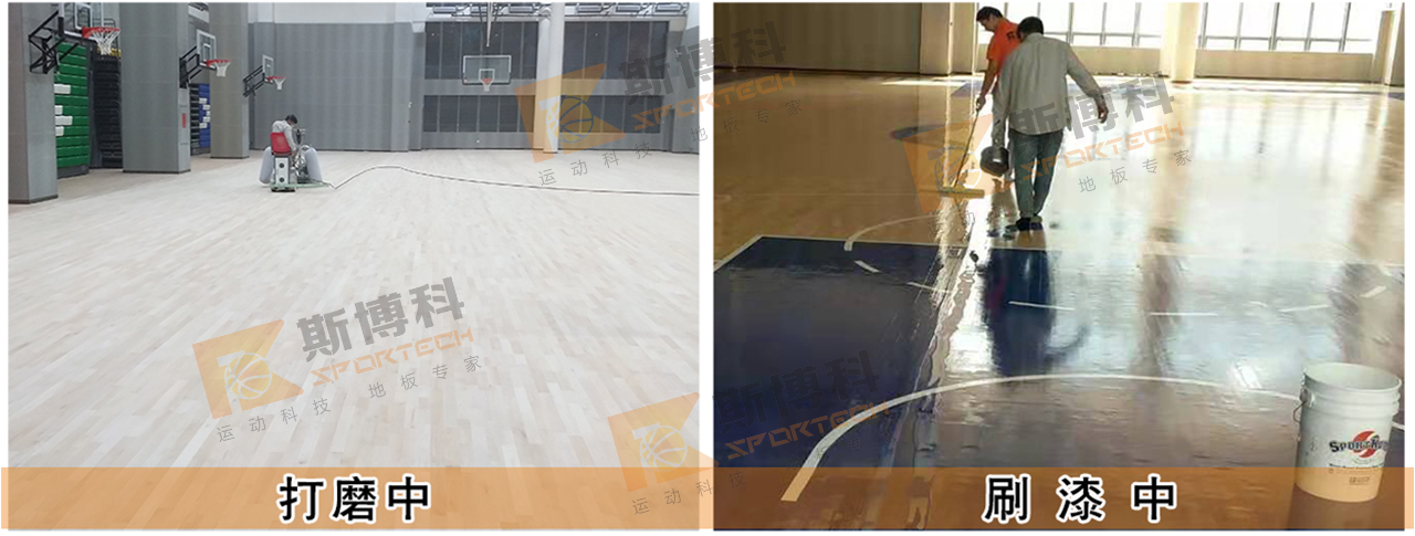 據(jù)現(xiàn)場實際情況并結(jié)合國際楓木協(xié)會對專業(yè)楓木運動地板的維保建議標(biāo)準(zhǔn),我司對整個場地徹底打磨重涂油漆及彩漆LOGO。這是根本性解決方案,表里兼治。整場徹底打磨地板,磨掉UV漆面,消除面板拼接不當(dāng)或輕微變形導(dǎo)致的高差,直至露出新的木質(zhì)層,板面坑洞及較大的裂縫會填補木屑膩子混合物進行修復(fù),營造出光滑、平整、連續(xù)的面層效果。新涂刷專業(yè)運動地板底漆可有效滲透進入木質(zhì)層,保護地板不受水汽及污漬的侵?jǐn)_;后續(xù)畫線漆、彩漆及面漆通過底漆牢固附著在地板上,形成連續(xù)、平滑的一體漆膜,持久耐用迪。