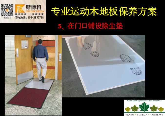 5、在門口鋪設(shè)除塵墊。場(chǎng)館內(nèi)部運(yùn)動(dòng)木地板漆膜直接影響木地板的使用價(jià)值,進(jìn)入場(chǎng)館內(nèi)部必須著穿運(yùn)動(dòng)鞋,外來人員進(jìn)入場(chǎng)館時(shí),腳底攜帶的沙粒等顆粒嚴(yán)重摩擦地板表面漆膜,在場(chǎng)館門口放設(shè)除塵墊能更好的預(yù)防場(chǎng)館內(nèi)部的漆面磨損