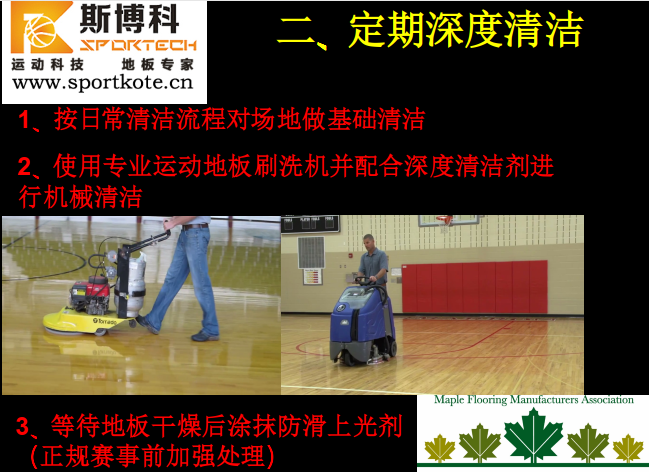 2、使用專業(yè)運(yùn)動木地板刷洗機(jī)并配合深度清潔劑進(jìn)行機(jī)械清潔