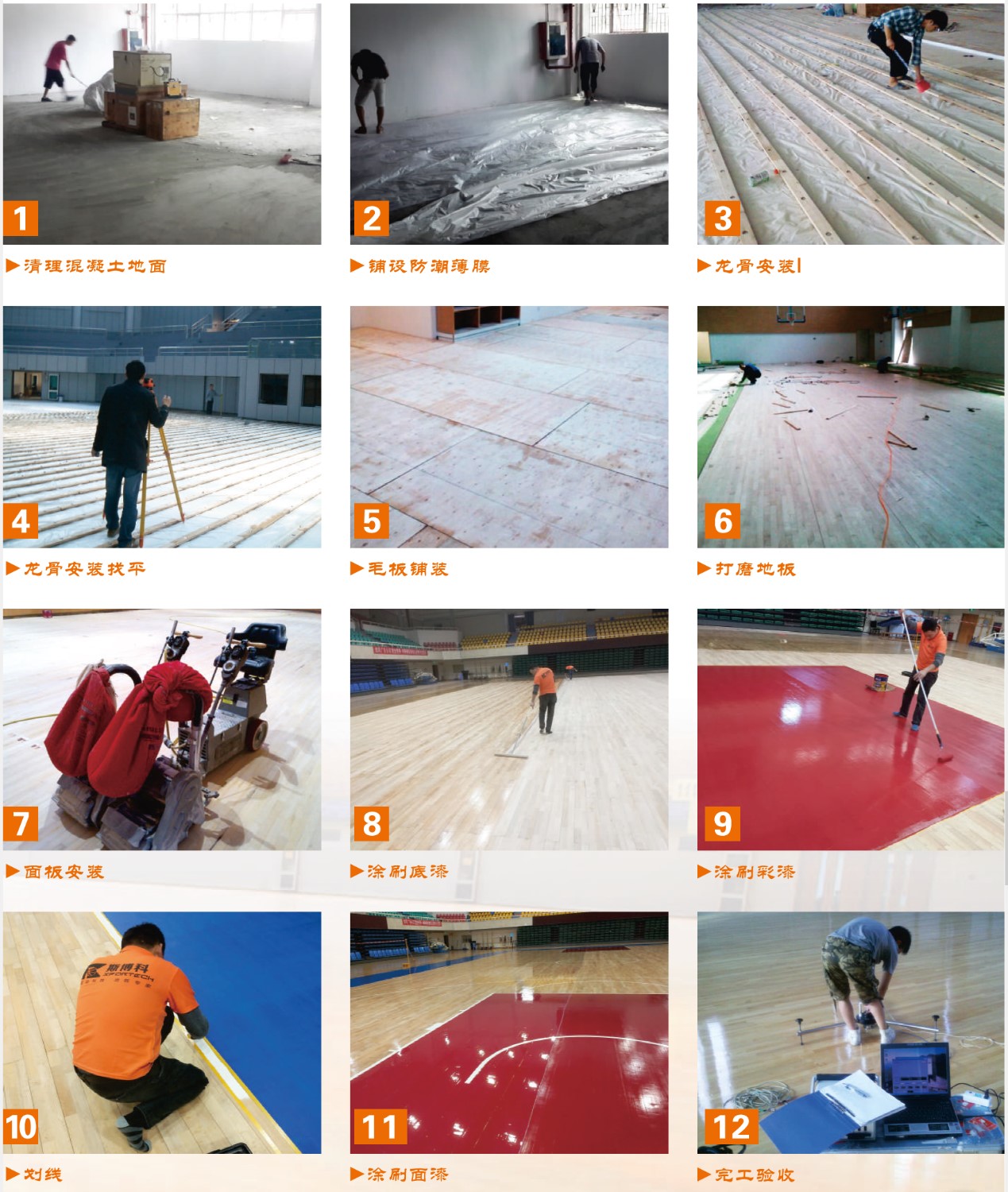 在產(chǎn)品結(jié)構(gòu)性能及材料均滿足專業(yè)運動需求的前提下,現(xiàn)場的實際鋪裝工藝也是非常重要的。五分材料,五分安裝,大面積鋪裝的運動木地板,必須要求安裝工人擁有合格的技術(shù)水平,確保場地安裝平整,根據(jù)現(xiàn)場實際情況充分做好地板的防變形及減燥控震措施,保證現(xiàn)場安裝的運動地板性能與廠家提供的產(chǎn)品技術(shù)指標(biāo)一致。