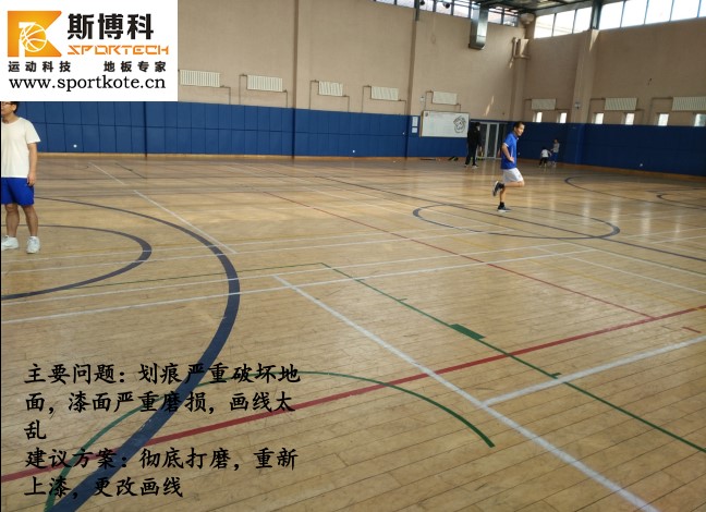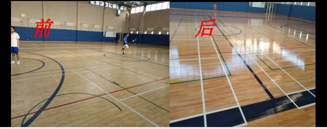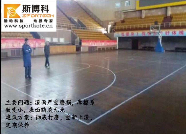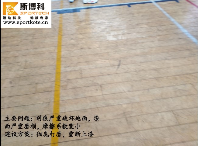 1.劃痕太多已經(jīng)破壞地板表面,同時(shí)污漬已經(jīng)嚴(yán)重浸入了漆膜內(nèi)部,由于長(zhǎng)時(shí)間不能得到深度清潔導(dǎo)致漆膜嚴(yán)重磨損,地板摩擦系數(shù)小不能承受運(yùn)動(dòng)員平時(shí)的訓(xùn)練。