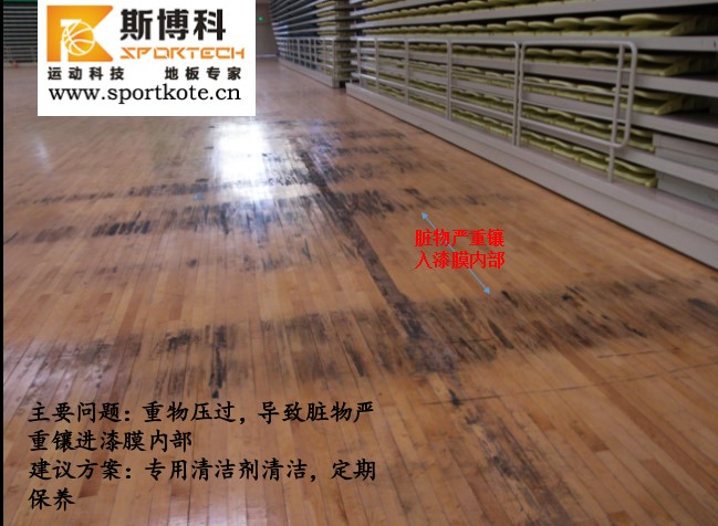 1.場(chǎng)館內(nèi)部的活動(dòng)看臺(tái)底部的橡膠滾輪長(zhǎng)期在地板表面活動(dòng)重物碾壓,導(dǎo)致滾輪上面的臟物鑲?cè)氲匕迤崮?nèi)部;