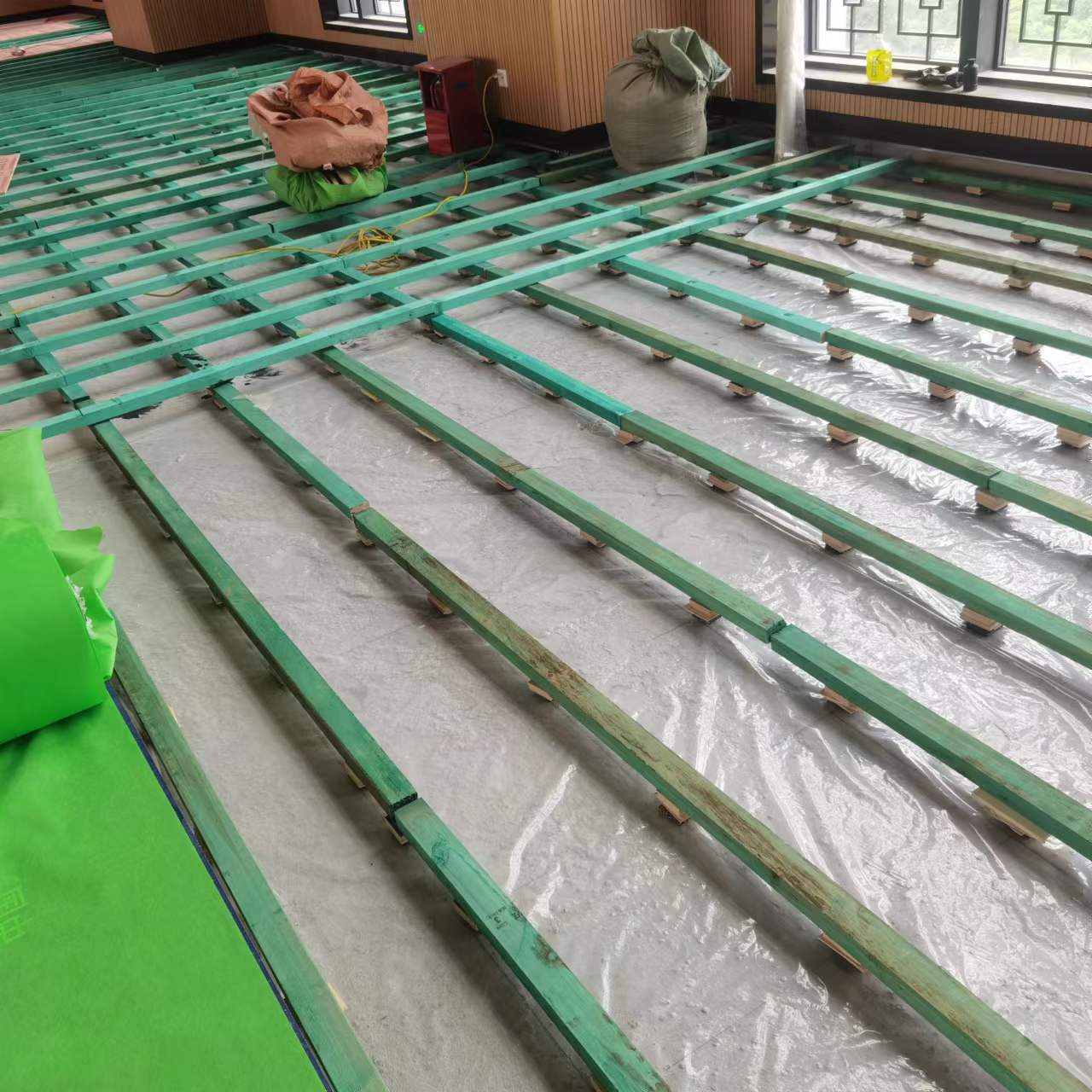 2、安裝龍骨前應(yīng)對平整度不得超過 3.0 mm/2 m;主要行走區(qū)域無松動或無異常響聲;應(yīng)使用防潮膜對地板進行隔潮處理。