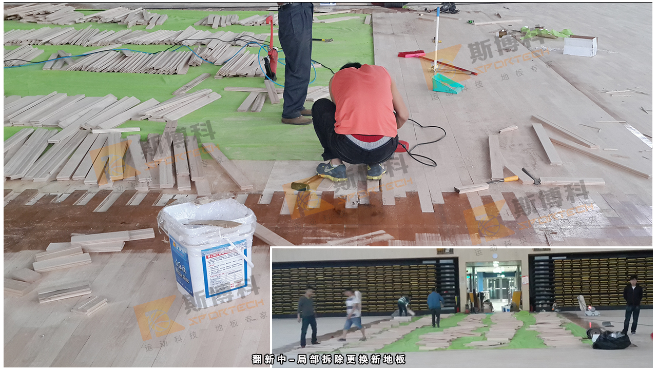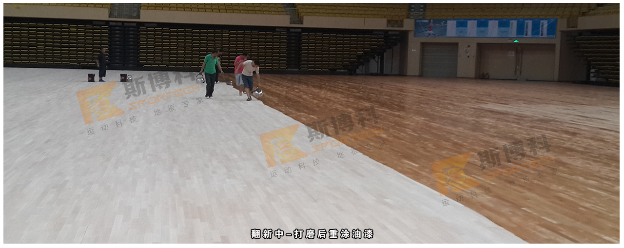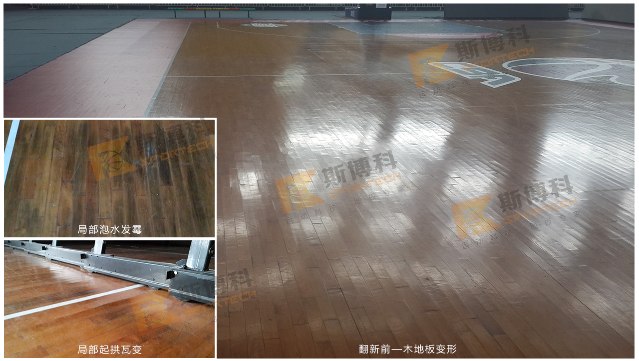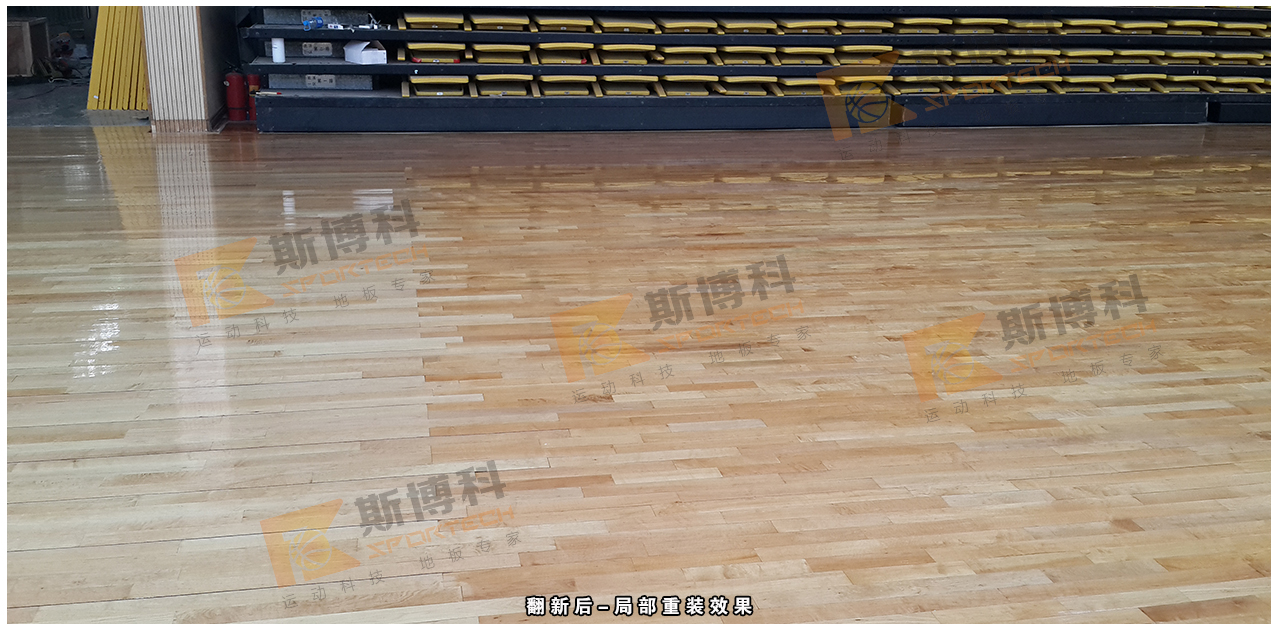 斯博科體育對(duì)泡水瓦變發(fā)霉嚴(yán)重區(qū)域進(jìn)行局部拆除,鋸齒狀錯(cuò)位重裝,無(wú)縫修復(fù)泡水區(qū)域地板,配合全場(chǎng)所有地板的徹底打磨重涂油漆方案,修復(fù)地板平整度,重新涂刷高性能專業(yè)運(yùn)動(dòng)地板漆,完美修復(fù)地板運(yùn)動(dòng)性能及漆面美觀效果。