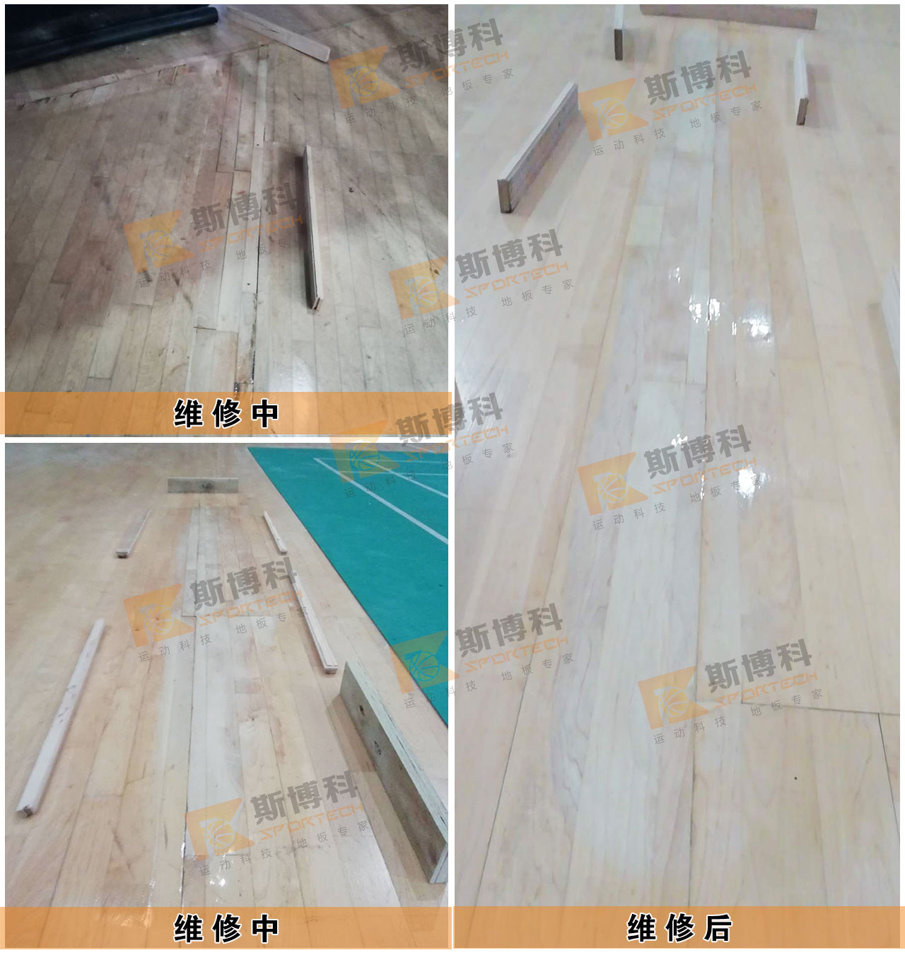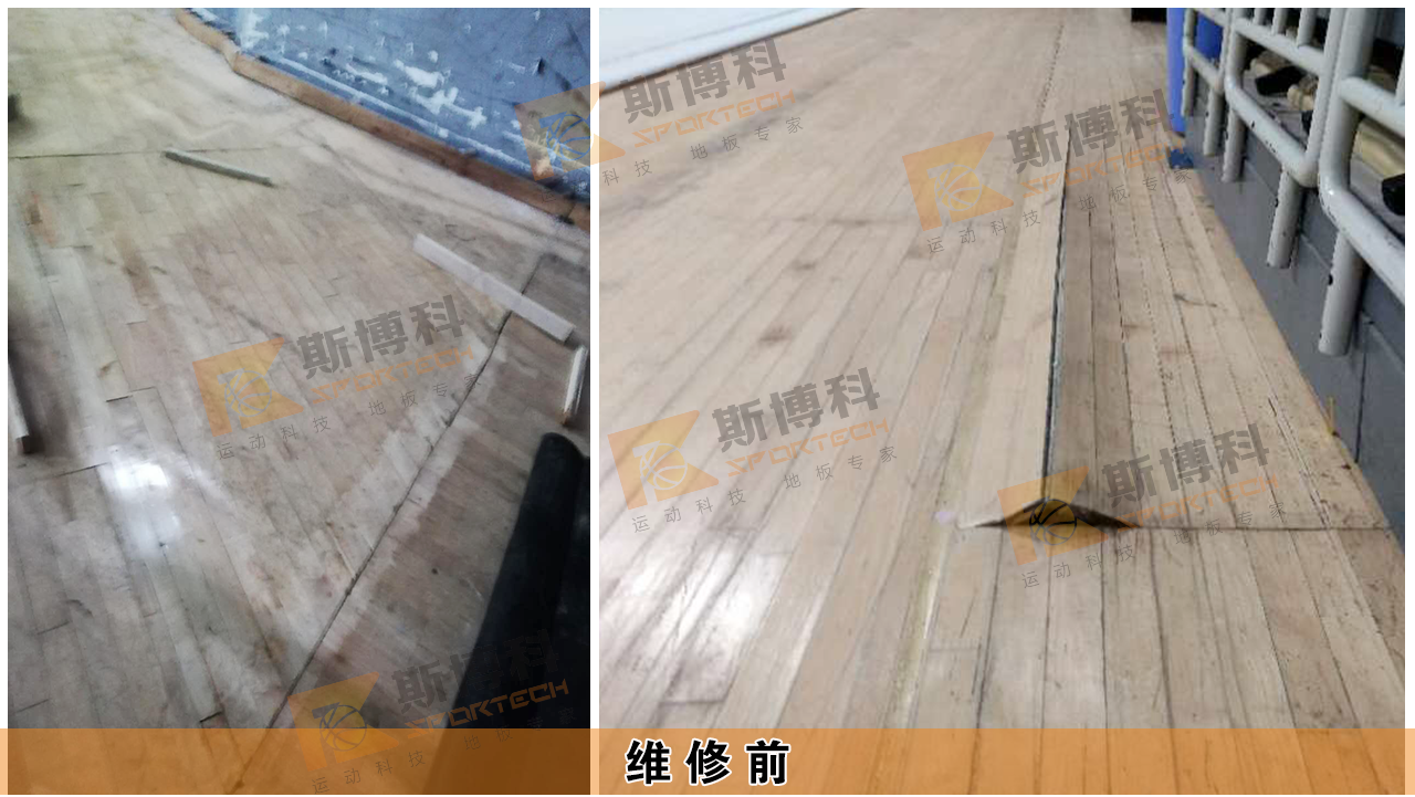 拆裝運(yùn)動(dòng)木地板局部受重壓導(dǎo)致結(jié)構(gòu)塌陷,并有部分面板受潮產(chǎn)生起拱,對(duì)局部地板進(jìn)行拆除并更換底部結(jié)構(gòu)及面板,再對(duì)新?lián)Q面板進(jìn)行打磨并涂刷專(zhuān)業(yè)運(yùn)動(dòng)地板漆,確保場(chǎng)館地板恢復(fù)正常使用。