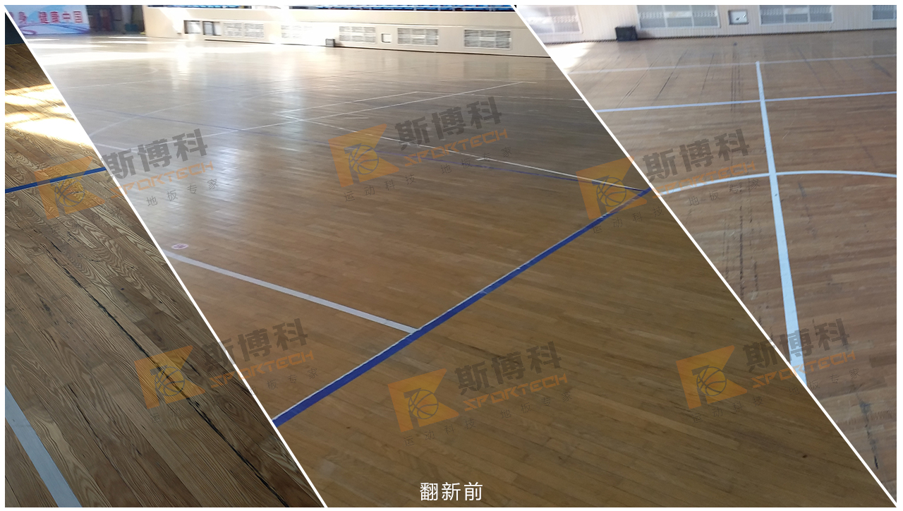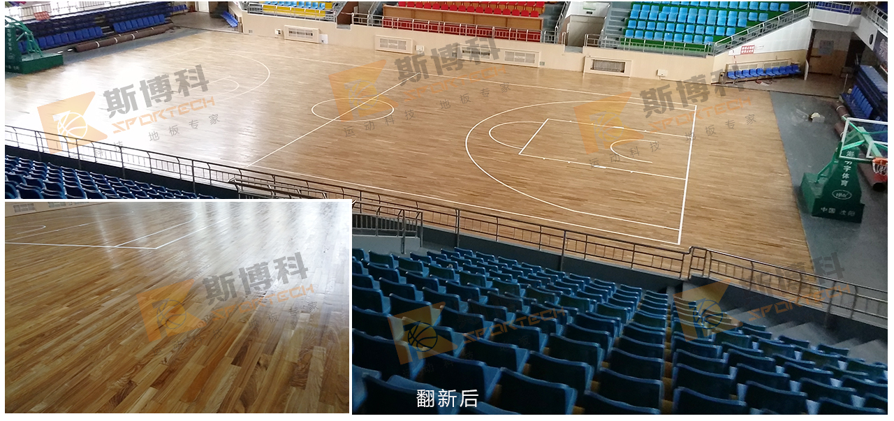 我司查看場館具體情況之后開始施工:場館由進口打磨機整體打磨; 然后磨掉舊漆面和地板上的劃痕,并對裂縫處進行補膩子填縫處理;之后上涂NBA場館運動木地板指定專用底漆(Sportseal)。最后由我司免費測量為場館制定畫線,最后再上斯博科(Sportkote)專用面漆。完工后效果煥然一新。高效,專業(yè),客戶對此表示非常滿意。