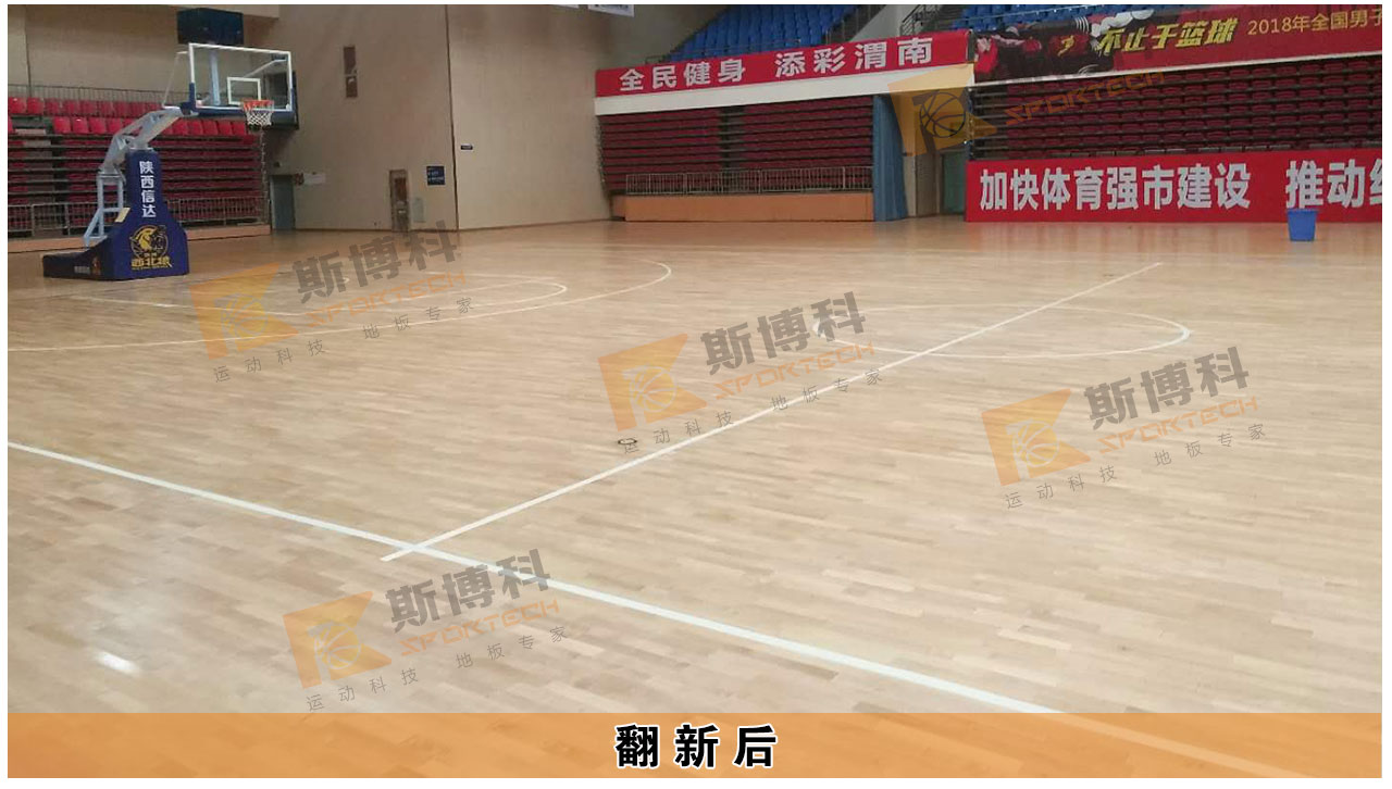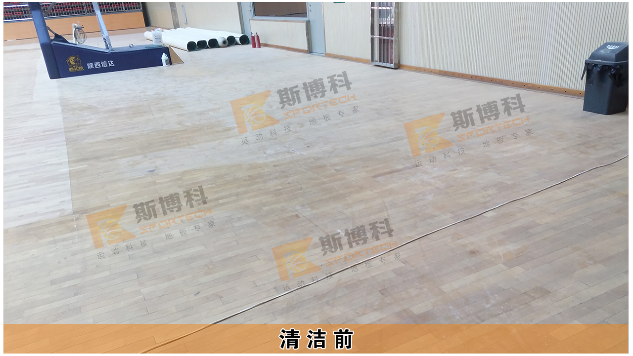 該場館運動地板漆面長時間使用后產生明顯磨損及漆面劃痕,并存在打滑情況,對籃球比賽區(qū)內進行徹底打磨重新涂刷四遍美國進口專業(yè)水性運動木地板油漆,徹底恢復比賽區(qū)內地板的運動性能及漆面防滑光亮效果,并對比賽區(qū)外輕度磨損區(qū)域進行深度清潔上光處理,清潔油污,恢復漆面防滑效果,提升漆面光亮度。