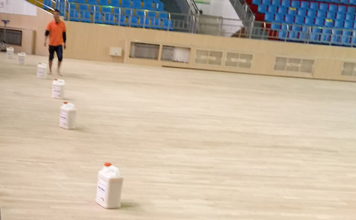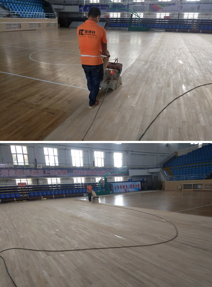 我司查看場(chǎng)館具體情況之后開始施工:場(chǎng)館由進(jìn)口打磨機(jī)整體打磨; 然后磨掉舊漆面和地板上的劃痕,并對(duì)裂縫處進(jìn)行補(bǔ)膩?zhàn)犹羁p處理;之后上涂NBA場(chǎng)館運(yùn)動(dòng)木地板指定專用底漆(Sportseal)。最后由我司免費(fèi)測(cè)量為場(chǎng)館制定畫線,最后再上斯博科(Sportkote)專用面漆。