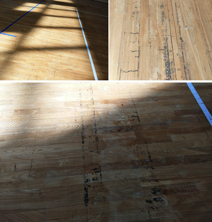 蘿北體育中心體育館已經(jīng)使用6年之久,活動(dòng)很多,長時(shí)間的運(yùn)營,導(dǎo)致體育場(chǎng)館的木地板表面漆膜磨損嚴(yán)重,劃痕明顯,木地板表面還附著垃圾黑點(diǎn),局部地板出現(xiàn)霉點(diǎn),失去了原有的光澤和感光性,據(jù)了解,客戶平常對(duì)場(chǎng)館木地板只做過簡單的清潔,沒有做過專業(yè)的維保處理。
